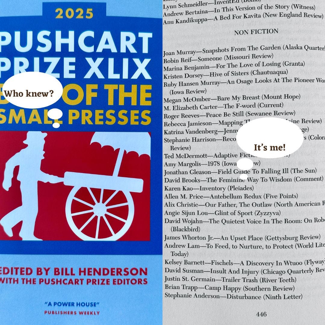Itβs good to have friends who read. Itβs great when they read the same kinds of books you do so you can share. But the very best is when you have a friend who reads the Pushcart Prize anthologies so thoroughly that she can tell you youβve gotten a Special Mention.